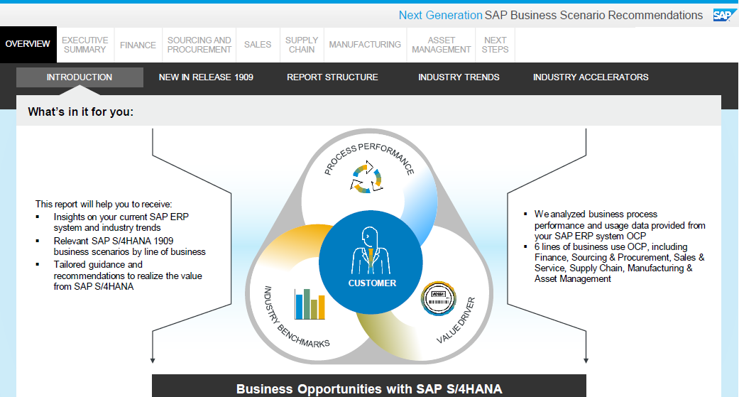 - Opportunities based on the customer’s current core SAP ERP system usage, business & IT performance