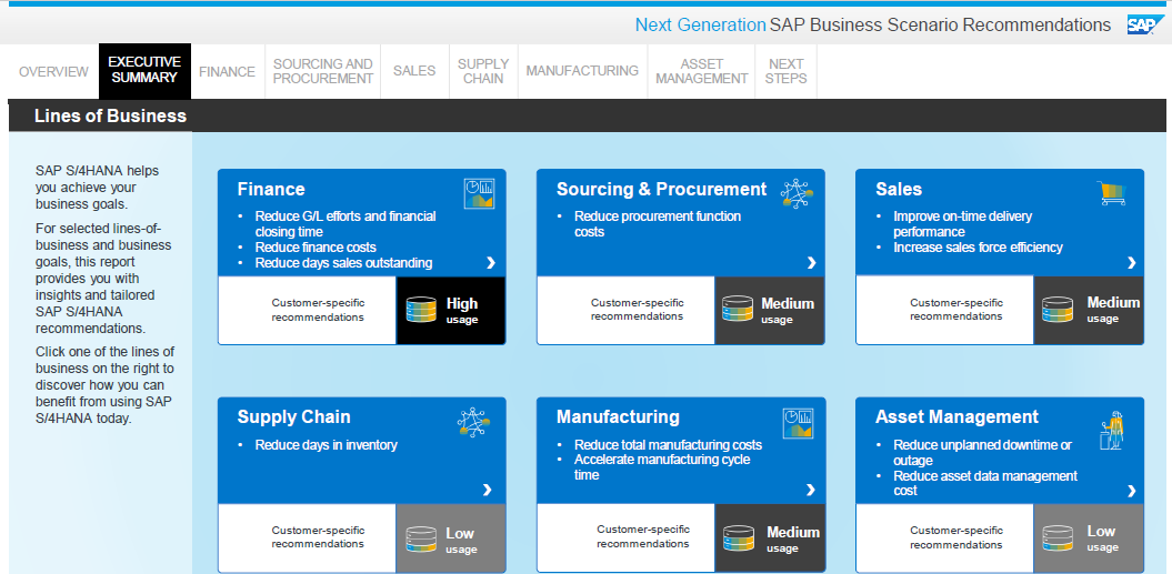 For selected lines-of business and business goals, this summary report provides you with insights and tailored SAP S/4HANA recommendations. Using the BSR, click one of the lines of business on the right to discover how you can benefit from using SAP S/4HANA today.