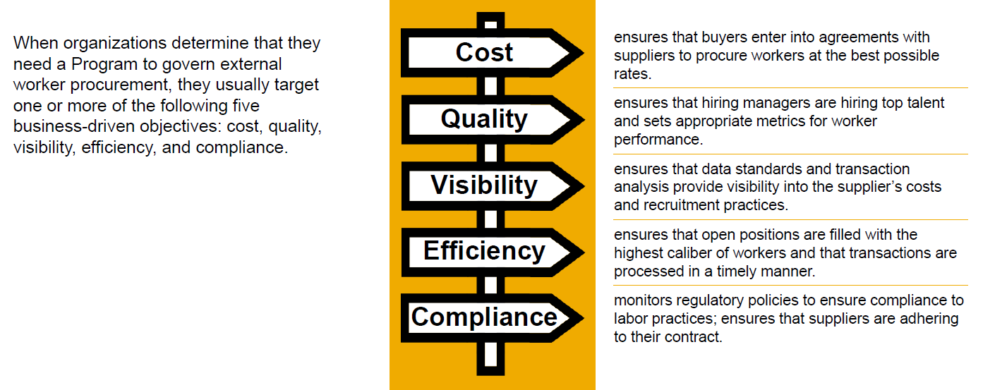 The PMO carries certain responsibilities and duties defined by the Buyer organisation. The program of managing an external workforce involves procuring workers at the best possible rates, ensuring a quality worker is provided by suppliers, and that processes for compliance with labour laws and contractual obligation are adhered to (among other things). Exhibit-2 below explains the typical responsibilities of PMO.