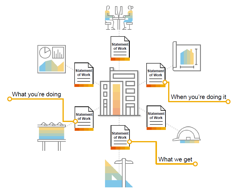 Statement of Work (SOW) is the guiding contract for the service provider. The SOW contains all the important aspects of what work will be done, when the work will be started/completed, what are the key deliverables as a result of such work, what should the quality of such services be, and other such things. A key point to observe is that the services delivery is directly governed by SOW terms and the buyer organisation will not have any day-to-day involvement or control of such activities.