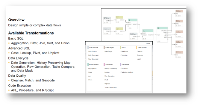 SAP has provided a graphical UI to create “Flowgraphs”. For Batch Mode data transfers, users can create, modify, and execute them in an easy way without having to do extensive development. The Real-time data transfers can be configured in a much simpler manner without having to even resort to Flowgraphs - just by selecting source, target, replication behaviour and other such parameters. Below is a sample flow graph and other capabilities.