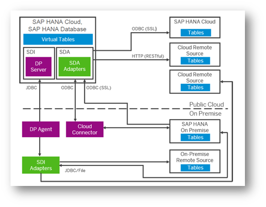 A key capability of SAP HANA is to integrate data from various sources, irrespective of whether the source is on-prem or on-cloud. The following two concepts are supported in SAP HANA Cloud: