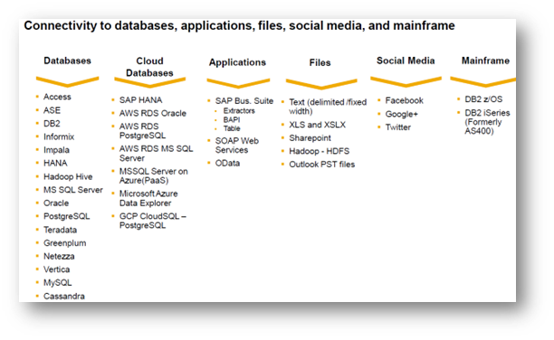 SDI is based on data replication and data transformation services to move data from other systems into HANA. The “native” integration capabilities can handle Bulk/Batch mode data transfers and real time replication from other systems to HANA. The data can come from On-Prem/Cloud/Hybrid data systems. SAP has provided out-of-the box adapters for common sources (like SAP Systems) and also open SDK for customers/partners to build custom adapters. Exhibit-7 below shows a glimpse of databases, files, systems supported by SDI.