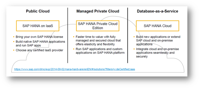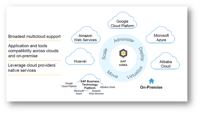 SAP HANA can be deployed On-Prem, Cloud or Hybrid models. SAP has already tested and certified many Cloud Providers like Amazon/Microsoft/Google for their compatibility. This helps give flexibility to customers and avoid the service provider lock-in challenges. Any development on the SAP HANA can be deployed to multiple cloud systems simultaneously. Customers can also leverage the Cloud Service Provider’s native services if they need to. This helps customer with enormous flexibility to choose a best path appropriate to their needs. This is explained in Exhibit-2 below.