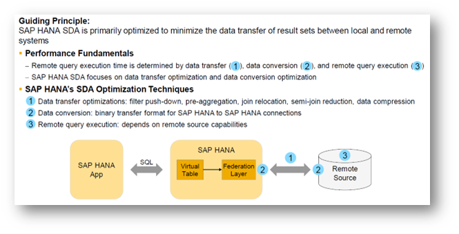The SDA guiding principle is to minimise the data transfer volume between remote systems and Core SAP HANA. This is achieved by remote query execution and transfer only of the results. There are many other optimisation techniques used in SDA, which are summarised in the graphical diagram shown below.