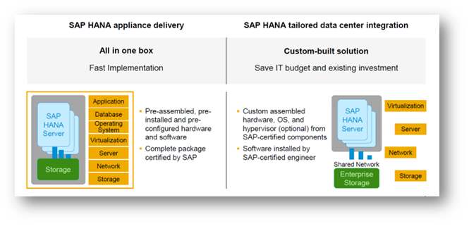 In the first choice, SAP has certified combo box of Application, Server, Database, OS and storage as a package. The customer can start the work, just out of the box, for a very fast implementation. In the second choice, the customer can work with SAP to identify the best possible choices that would work with their existing systems, with necessary flexibility and openness built into them. It helps customer to save IT budget and their existing investments. This is explained pictorially in the diagram below.