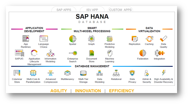 Consists of Application Development Capabilities, Smart Multi-Model Processing abilities, Data Virtualization possibilities and database management tools. On the Application Development side, it supports multiple languages, standards like SAP UI5 and complete application life-cycle management capability. Apart from handling columnar database, handling geo-spatial queries (e.g. how many customers are within a 3 km radius of this store), graph analysis, documents to store unstructured data (e.g. external JSON data) and other features are part of Smart Multi-Model Processing. On the Data Virtualization, data caching or data replication or federating data from other systems are other features that are in-built. On the data management side, it has features of multicore and parallel processing, multi-tenancy, multi-tier storage and many other similar high-end capabilities. It is pictorially depicted in Exhibit-1 below.