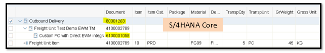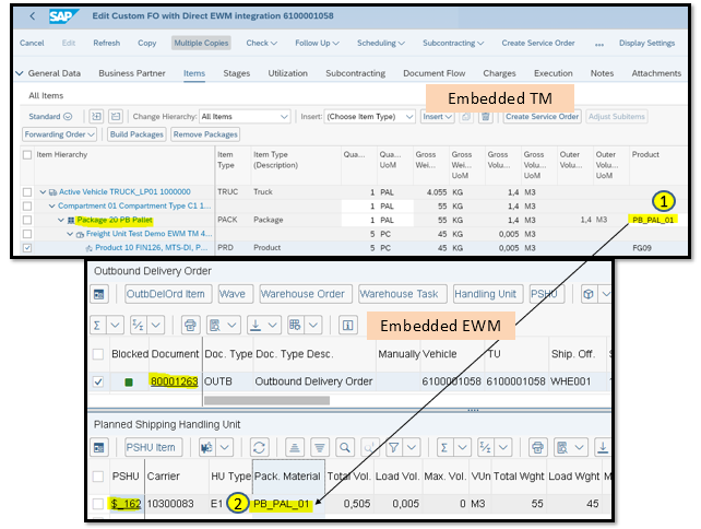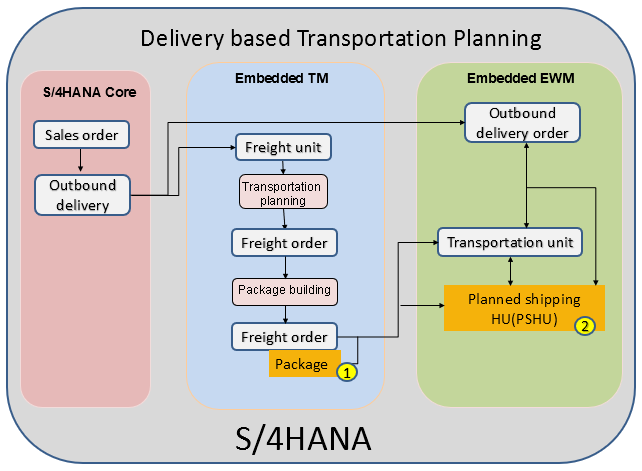 A typical process flow diagram for direct integration between TM and EWM with S/4HANA is shown in the below image for Delivery based transportation planning. Outbound delivery from S/4HANA core gets distributed/transferred and automatically creates Freight unit (FU) and outbound delivery order (ODO) in embedded TM and EWM respectively. A freight order (FO) is created after transportation planning. A freight order can be correlated to a truck. ‘Package building’ functionality of TM creates packages (or pallets) for the relevant deliveries in freight order with the relevant packaging material as set in TM master data - and as shown in section (1) of the below image. Once the ‘Load plan’ is finalised for the truck, the freight order is transferred from TM to EWM which creates a Transportation unit in EWM. Package from TM creates a Planned shipping handling unit (PSHU) in EWM.