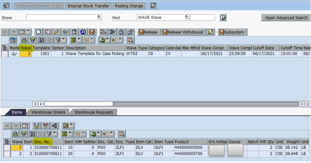 In this use case you work with waves. The system automatically creates PSHUs for waves. The system uses the PSHUs as templates for proposing packaging materials or destination HUs during packing at the work centre or using radio frequency (RF).