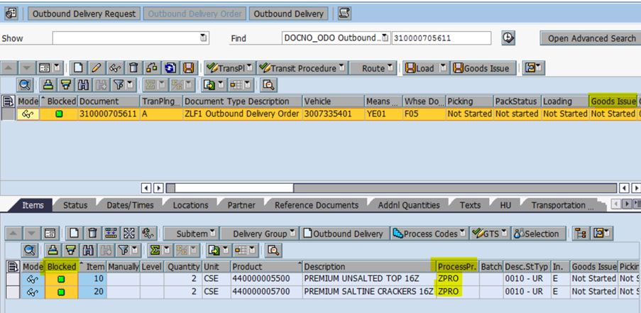 1. The delivery item has the status Blocked (Unchecked Item) with an initial value, which means that the item is not blocked.