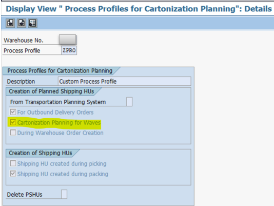 3. The delivery item has a process profile for Cartonization planning in which the checkbox Create Planned Shipping HUs for Waves is selected.