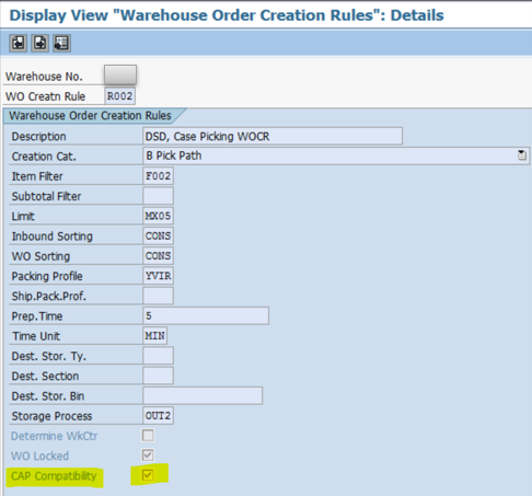 1. To enable the use of a warehouse order creation rule for Cartonization planning, you have selected the CAP Compatibility checkbox of the rule.