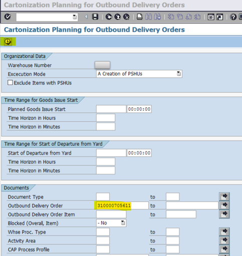 To start Cartonization planning for outbound delivery orders, execute the transaction T-code: /SCWM/CAPDLV