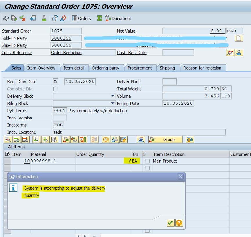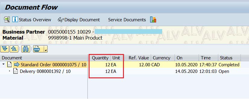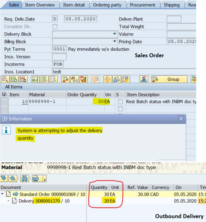 Change the SO in ERP and check how it impacts the other objects delivery, ODO. On changing the SO qty 40-->30 EA, the system prompts a message and automatically adjusts the outbound delivery quantity as well.
