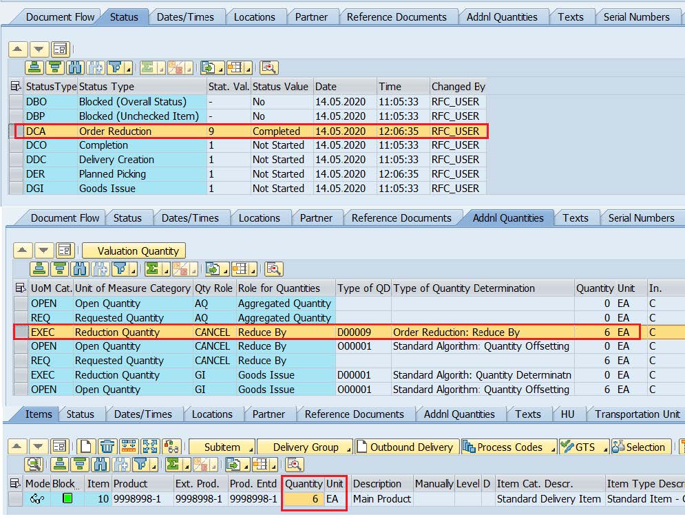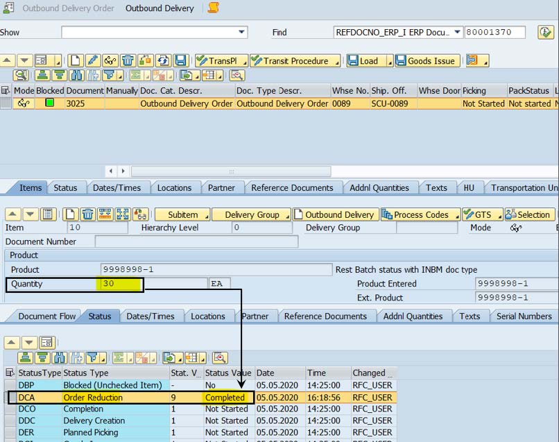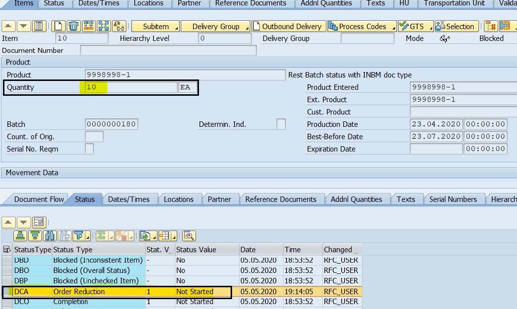 Also the EWM ODO quantity is same as 10 but an extra ‘’Order Reduction’’ confirmation message is sent from ERP to EWM and ODO has status DCA=1( Not started)