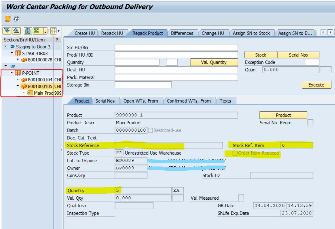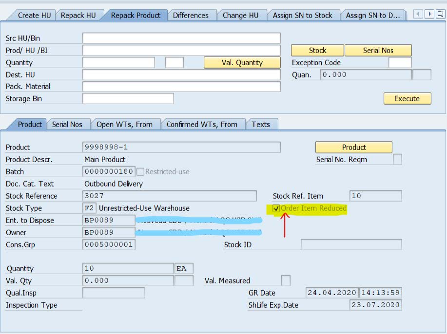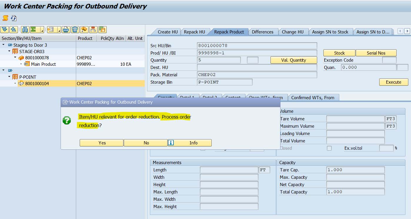 Since, we reduced the sales order from 10 to 5 pcs during packing, Warehouse worker during scanning the cancelled product, he/she can repack the product at "Pick Point’’ and later transfer the HU to the source Bin and ship the remaining quantity to the customer.