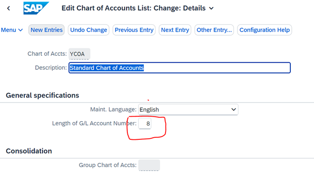 Screen showing “ Edit Chart of accounts “ and Length of G/L Account Number