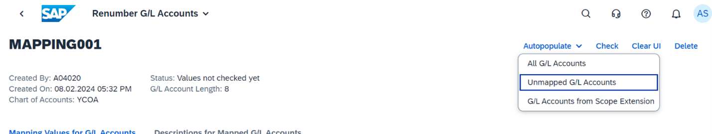 Unmapped G/L Accounts: This option is useful for renumbering after go live, newly activated G/L accounts or GL accounts added because of adding additional country etc. or previously delivered G/L accounts which have not yet been renumbered and have no postings in T and P system.