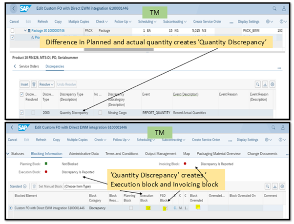 This difference in planned and actual quantity in FO in TM triggers ‘Discrepancy Handling’ in TM. The below image shows ‘Quantity Discrepancy’ as set automatically in FO due to difference in planned and actual quantity in FO in TM, and also the ‘Execution block’ & ‘invoicing block’ due to ‘Quantity Discrepancy’.