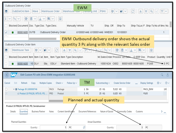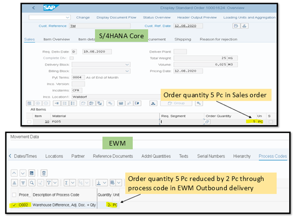 In our present scenario, we have considered that the sales order has 5 Pc as the order quantity and "5" represents the ordered or planned quantity in the relevant objects in the above image. However, only 3 Pc could be picked and loaded to the truck and the reason can be damage or non-availability of other remaining or 2 Pc for the same product. Actual quantity 3 EA picked (and goods issued) is reflected in relevant objects as "3" in the above image. The below image shows that the Sales order was created for 5 Pc and the quantity in EWM ODO has been reduced by 2 Pc through process code as only 3 Pc could be picked due to non-availability (or damage).
