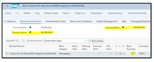 This execution block is essential for some scenarios in which Customer (or Customs) will NOT accept reduced quantity etc. FO can only be executed after the discrepancy is resolved or overruled. These blocks get removed after the checkbox for ‘Block overruled’ is flagged, as shown in the below image.