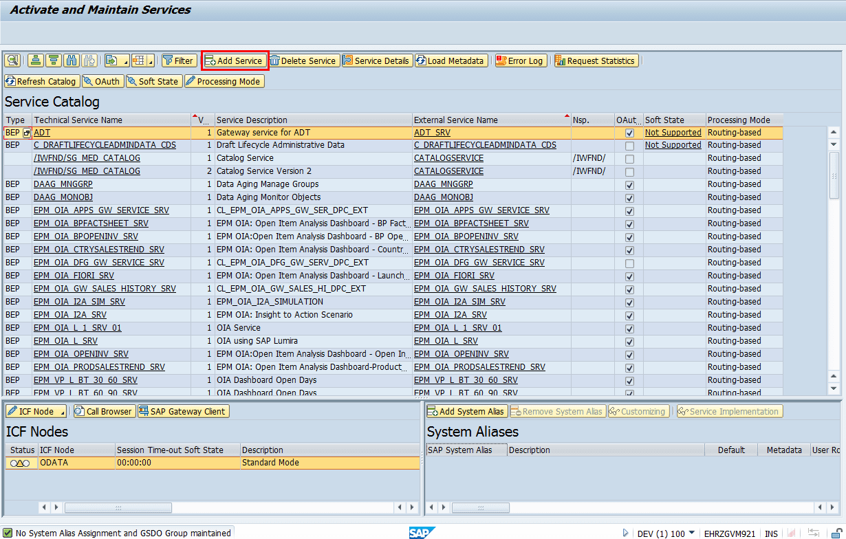 3. In the ERP Backend system in transaction SICF the following default_host nodes must be activated: sap/iwbep, bc/adt, bc/webdynpro/wdy_aie_vd_preview, sap/public/opu, sap/opu/odata.