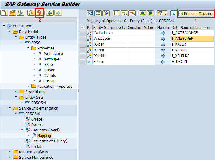 The Service Builder (transaction SEGW) allows for centrally displaying and creating the definition of an OData service. This includes runtime artefacts (model provider class [MPC], data provider class [DPC], model, and service), OData artefacts (entity set, entity type, and properties), as well as data sources and models.