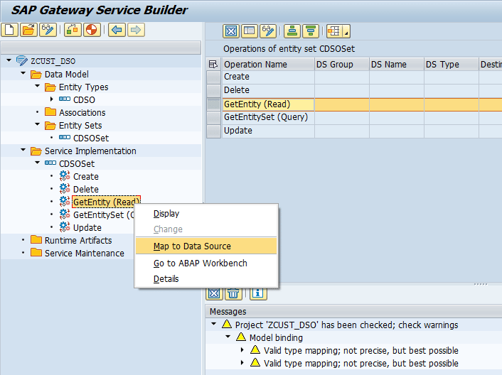 By using Service Builder (transaction SEGW), we create project ZCUST_DSO.