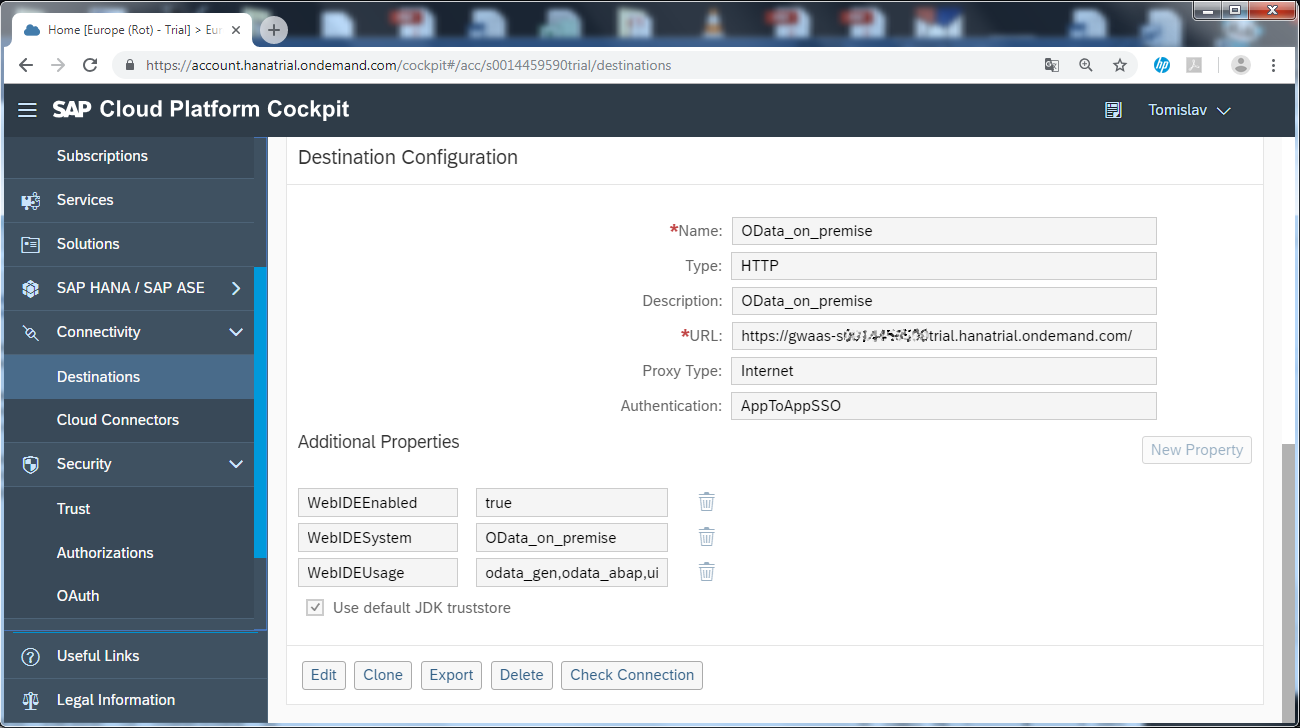 After service registration, we can generate Web IDE application based on our service. For that purpose, we need to create a destination which connects the Web IDE with the OData provisioning. It enables both tools to talk to each other.