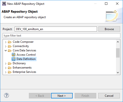 Open the File menu, select New and then click on ABAP Project. Choose the ABAP backend system from the list of SAP System connections and press the Next button.