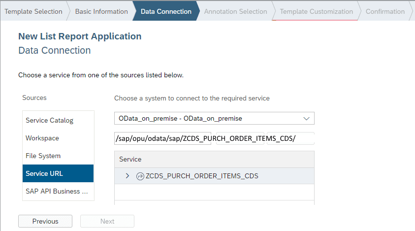 We choose File -> New -> Project from Template -> choose List Report Application and in the next step enter Project Name and Title. After that, you need to fill in your OData service details.