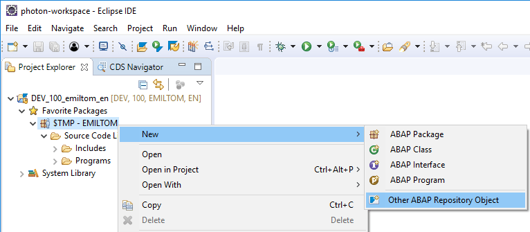 After ABAP Project has been created, choose your ABAP package ($TMP if you don't need a transport request) and from the context menu of your package choose New and then choose Other ABAP Repository Object.