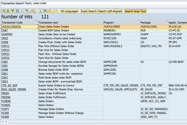 From here, you can search for key words. In my example, I am searching for all transactions and apps with the words “sales order” in them: