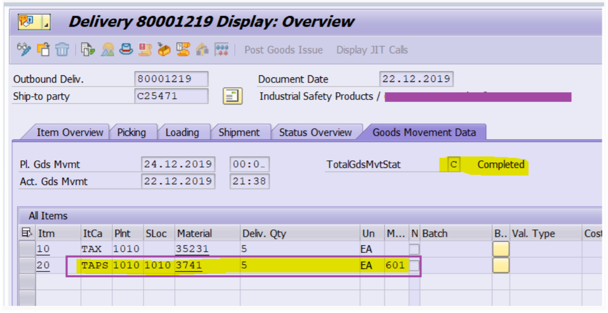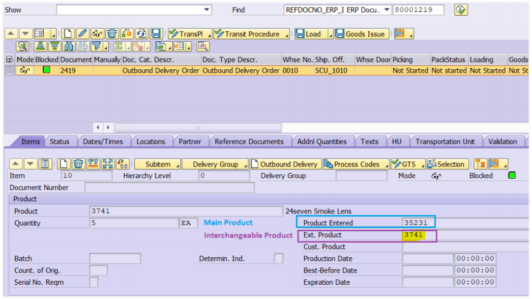 The goods issue is posted with movement type (601) for the item category TAPS of the interchangeable product. The main product is not relevant for goods issue as movement type is blank.