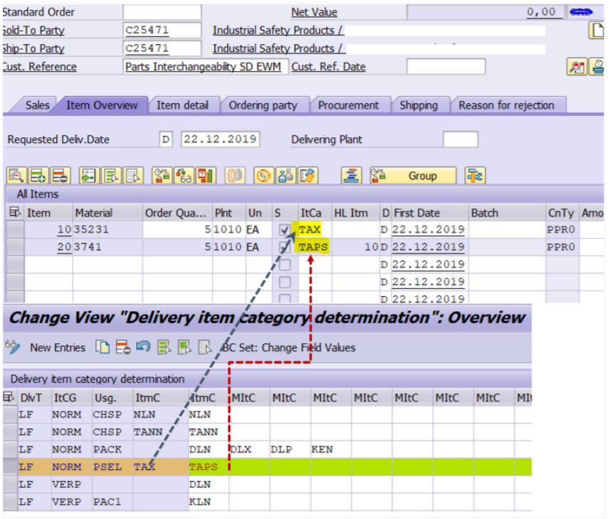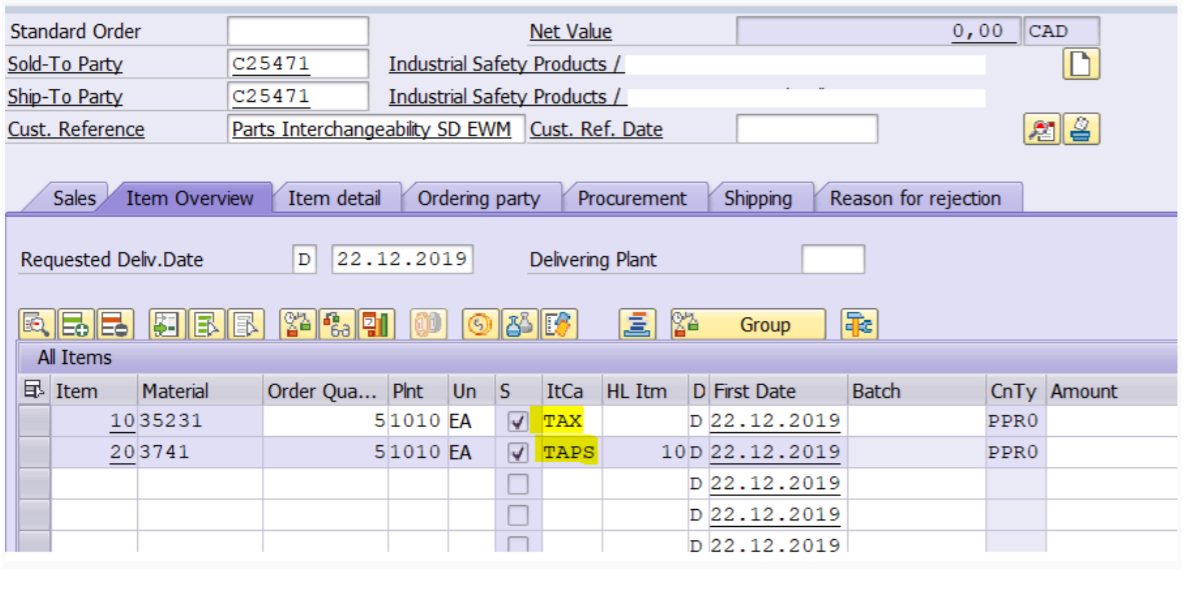 The main product (35231 Item category TAX) is automatically substituted for the item category TAPS via item category customisation with interchangeable product 3741.