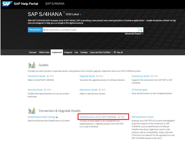 This will take you to the latest S/4HANA product – release 2020. From here, select the Simplification List for SAP S/4HANA: