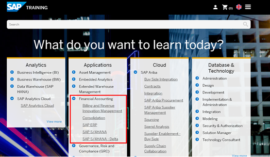 The line is https://training.sap.com/ and the landing page is as below. By hovering over a functional area, the menu opens and reveals specific topics to learn.