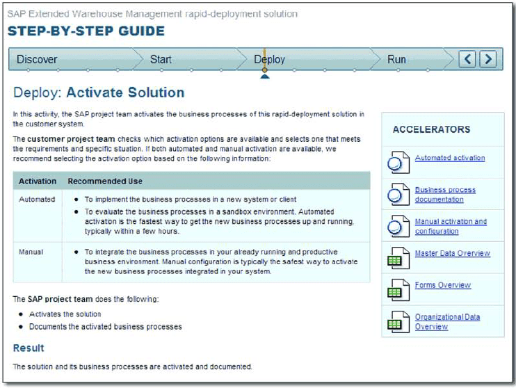 As an example, Figure 5 shows the RDS of SAP Extended Warehouse Management (EWM) component that provides a step-by-step approach to implementing EWS by using the next-generation SAP implementation methodology known as SAP Activate. To learn more about SAP Activate, check out Eursap’s blog How to use SAP Activate for your SAP S/4HANA Roadmap.