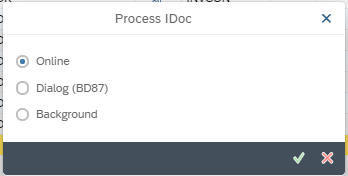 This allows you to process the IDOC in the event of the IDOC being as yet unprocessed, or in error state. The options displayed when hitting the “process” button are Online (process the IDOC in the foreground), dialog BD87 (process the IDOC using the traditional BD87 route) or background (process the IDOC in the background).