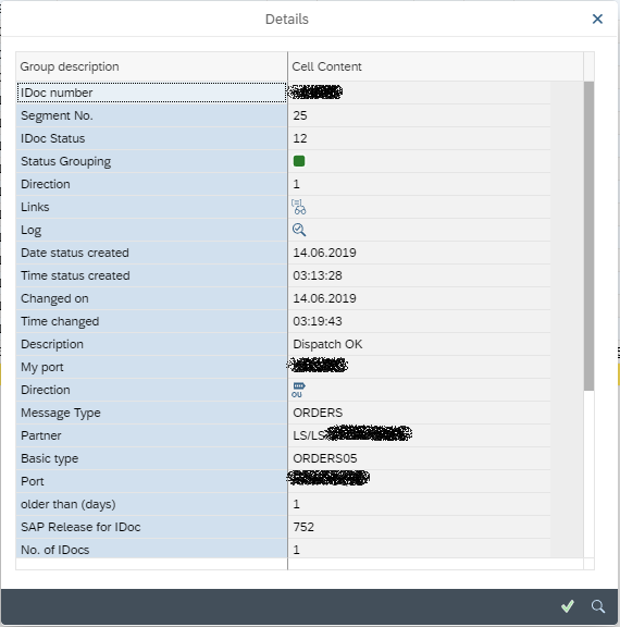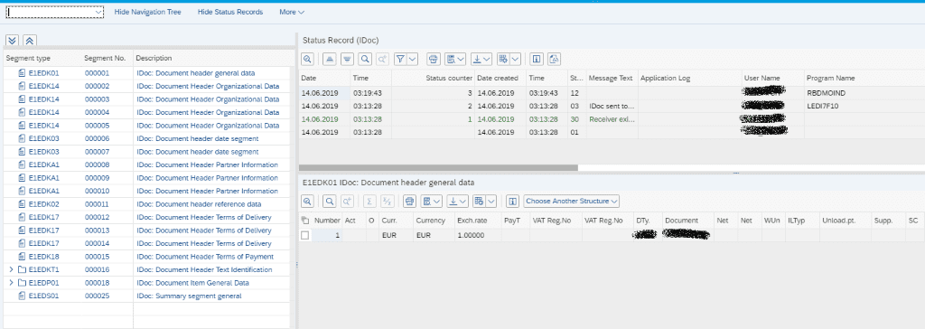 This opens up the IDOC in a new style view from the traditional views in WE02, WE05 or BD87. The control data record is not shown as this can be seen from the Details icon (see above). Instead the IDOC segments are shown on the left and details are displayed in the bottom right section of the window. The Status Record of the IDOC is shown in the top left and can be hidden.