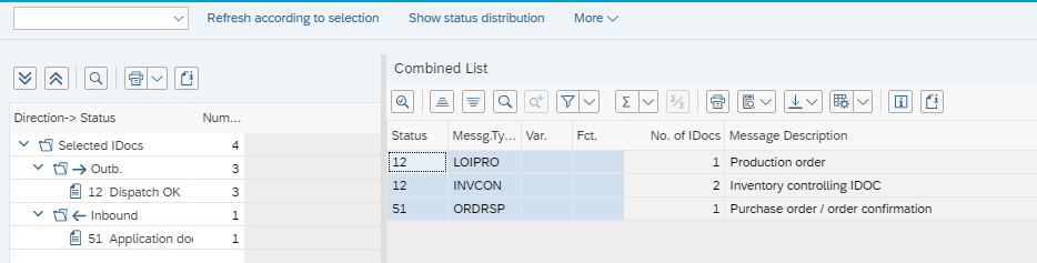 Selecting “by Status” will group the entries by status as below. In this example, we have one IDOC in error status (status 51) and three with status 12, dispatch OK. These are grouped on the right-hand side by message type