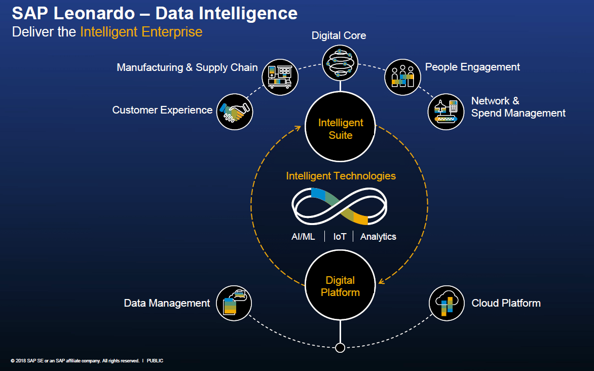 In the evolution, optimization of tasks had been the primary focus. We had “Industrial Automation”, then came “Business Process Automation”, followed by “Digital transformation”. SAP has articulated “Intelligent Enterprise” as the next in the evolution chain. Intelligent Enterprise has three key components. The first component is “Intelligent Suite” which consists of Digital Core (read S/4HANA), CRM, SRM and suite of SAP products. The second component is “Digital Platform”, consisting of “Data Management” and “Cloud Platform”. The third component is “Intelligent Technologies” consisting of Machine Learning (ML), IoT and the like. Leonardo represents “Intelligent Technologies”, which is presented in the centre of the circle in the diagram below. I will articulate each of them in brief, in the subsequent sections of this article.