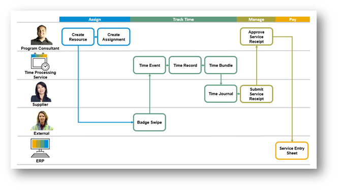 The high-level overview of a typical process is explained below. This scenario is an integrated system with badging system and the time data flows to the “Time Processing Service”. There can be other scenarios where data could be manually entered. It is pictorially shown in exhibit 3.