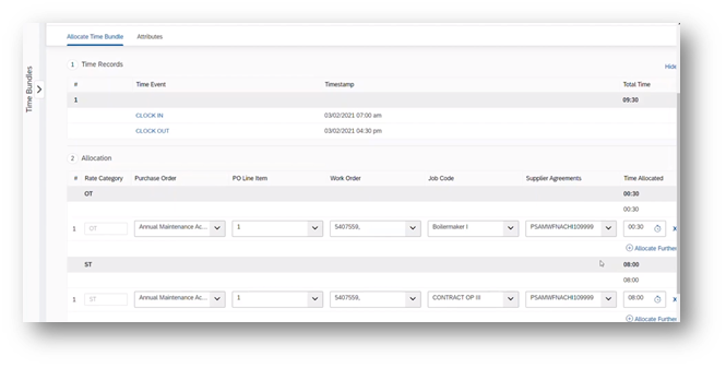 Time Bundle: Multiple time records are combined to generate a time bundle. Time bundles are used to allocate one or more rates, task categories, maintenance orders, offsite work, purchase orders and job skills to determine cost allocation.