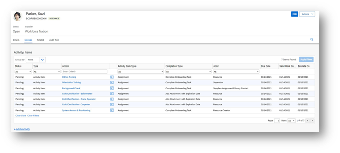 The above key data drives further activities when the resource starts work. For example, the necessary onboarding and offboarding tasks appear in a separate tab for the resource based on the activity check list. It can be monitored and updated as and when they are complete. This helps the organisation to ensure regulatory compliances. A sample screen is shown in exhibit-5 below. At the end of the project or contract, the resource offboarding process can be completed. The resource is then technically “Closed” in a simple process in the system.