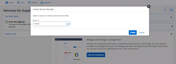 The system automatically opens up a window, wherein the timekeeper has to choose the buyer organisation and click “create”. A service receipt is automatically generated and submitted to the buyer via a worklist. This is shown in exhibit-9 below.