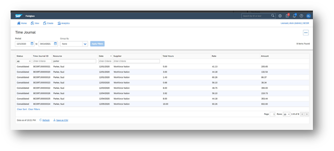 Time Journal is a journal record created for a combination of attributes e.g. Rate Category, Purchase Order number, Resource ID and Day. The overall time recorded in a time bundle is allocated for these combinations of attributes. This is done by a timekeeper.