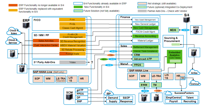 However, the SAP landscape of ECC6.0 still looks pretty straightforward when you compare it to the deployment options of S/4HANA, as shown in this diagram (provided by SAP SE). Lots of applications all connected with each other, some of which are now embedded into S/4HANA and some are not.