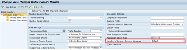 New functionality – Handling of incorrect inbound messages has been introduced. This functionality will help the business user to analyse how errors are handled in SAP TM business subject for freight documents specific to inbound. In case the selection criteria are specified as default, there will be no change in the business document since in that case it is considered as a rejection. However, if the selection of the message is set to -Enable saving of documents with error, then the business document is created or changed based on the message data. Although the incoming message data may be an error message due to certain missing master data or missing assignment of predecessor documents.