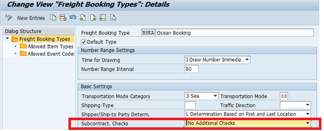 New functionality – Subcontracting checks has been introduced in various freight documents like freight order/freight booking/service order. This field provides a validation/check rule once the freight document is ready to be subcontracted to the carrier. In case the option-Basic additional checks are selected in the freight document type, the system validates if procuring company code, purchase organisation and purchasing group data is maintained in the freight documents. In case these field values are missing, the subcontracting process cannot be triggered for the specific carriers.